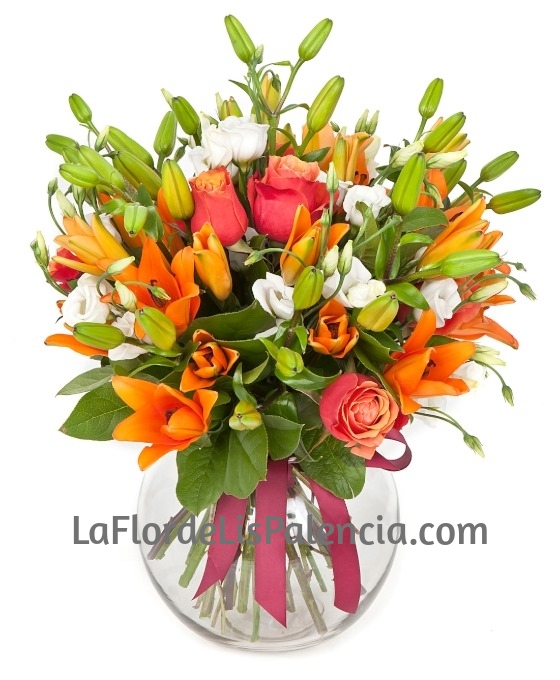 Ramo Flores Luxemburgo, bonito y alegre, realizado con lilium rosas, lisianthums, en tonos naranjas y decorado con verdes variados que le dan a este ramo de flores de regalo un aire silvestre y alegre a la vez. Tiene una calidez de colores especial, que se asemeja al verano y que seguro alegrará a la persona que lo reciba. Somos una floristería de Palencia de floristas profesionales dedicados al envío de flores, especialmente de flores para regalar. Además, hacemos entregas de ramos de flores donde lo precise.